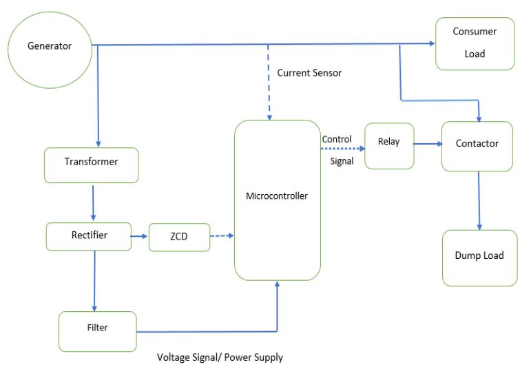 Electronics Load Controller (ELC) help to maintain the power balance between produced electricity and consumed electricity by dumping the excess electricity into the dump load. Thegenerated voltage isstepped down using stepdown transformer. Stepdown AC voltage is passedthrough half wave rectifier circuit to produce DC voltage. DC voltage is passed to 5V voltage regulator and then it is passed to the Arduino through a filter. Current sensor measures the current and sends the signal to the Arduino. Zero Crossing Detection (ZCD) help to detect the frequency of produced electricity. All these signals are transferred to Arduino to compare the mis-match Power. A condition is checked if the power is greater than the consumed, then the dump load is on by sending signal to the relay from Arduino. After completion of the project ELC help to maintain power balance between consumer and dump load.